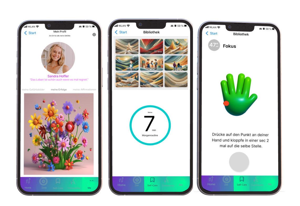 Aus dieser Frage entwickelte Jasmine eine Struktur mit kleinen, direkt im Alltag anwendbaren Methoden, die das mentale Wohlbefinden nachhaltig stärken. Dieses Wissen wollte sie mit der Welt teilen, für alle zugänglich. Die Antwort war klar: Eine App, die Menschen überall und jederzeit in ihrem mentalen Gleichgewicht unterstützt.